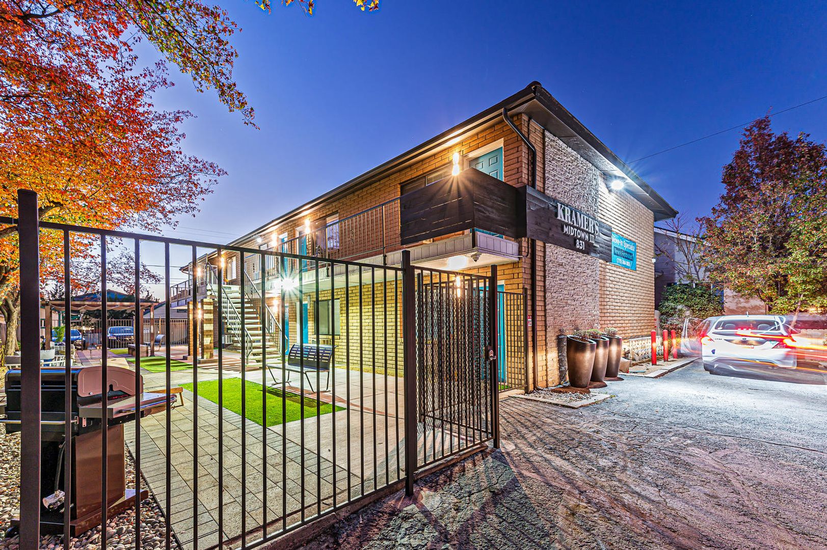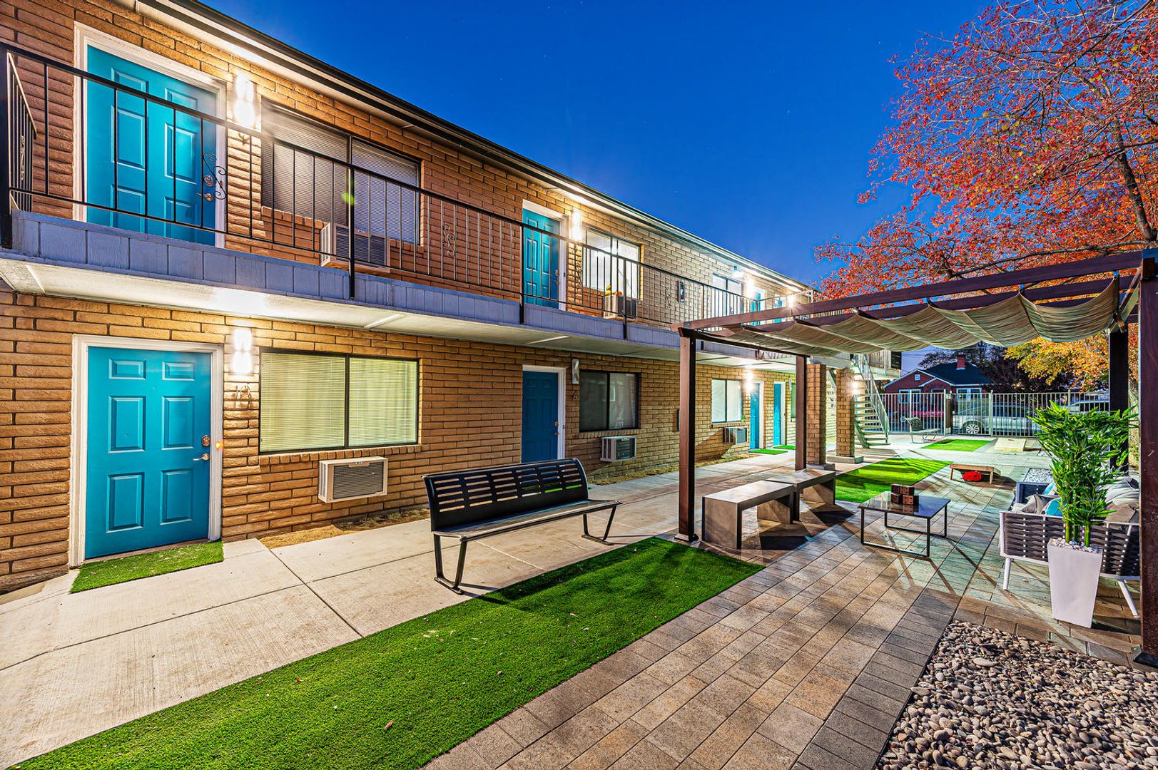 This property offers a private courtyard with cornhole and a sitting area.